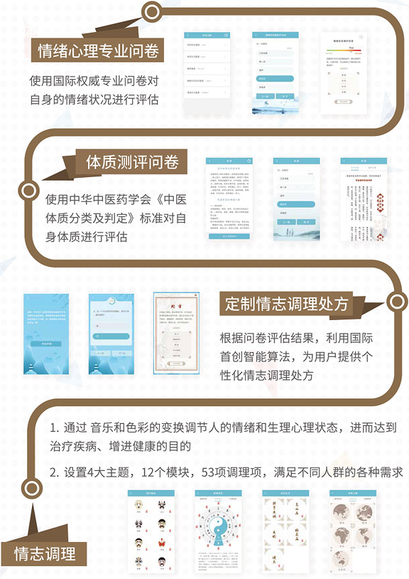 (1)國(guó)際首創(chuàng)的融合藝術(shù)、人文、心理學(xué)、中醫(yī)、腦科學(xué)、多媒體等多學(xué)科的情志調(diào)理系統(tǒng),并在慢性疾病非藥物治療領(lǐng)域開(kāi)展了有益探索。