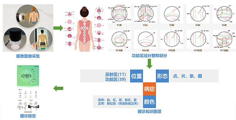 罐診是中醫(yī)診斷的重要手段之一,是在人體背部督脈、膀胱經(jīng)上的反應(yīng)點(diǎn)選取相應(yīng)的功能反應(yīng)區(qū)扣拔11罐,扣拔五分鐘后起罐形成的罐象結(jié)合中醫(yī)學(xué)說(shuō)的寒熱虛實(shí)等來(lái)判斷人體五臟六腑的功能狀態(tài)?;诓W生物集團(tuán)有限公司開(kāi)發(fā)的罐診儀,研究院開(kāi)發(fā)了基于人工智能的罐診信息系統(tǒng)。該系統(tǒng)通過(guò)罐象反射區(qū)和功能區(qū)圖像分割,根據(jù)各區(qū)域的形態(tài)和顏色特征,自動(dòng)識(shí)別健康狀態(tài)和易患病癥,并形成罐診報(bào)告。